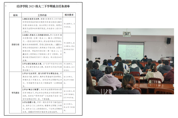 2月24日下午,2023級開展新學期學生干部工作會議,2023級輔導員華文健、徐文洋,各班班長、團支部書記參加會議。會上,華老師與徐老師就近期重點工作予以布置安排,同時針對大二下學期的全期工作進行了預布置及預動員;并強調學生干部要認真學習重點工作要求,迅速調整狀態(tài),踐行責任擔當,認真落實學院“黨建+學生工作”實施辦法,積極為年級師生、為班級同學排憂解難,發(fā)揮骨干模范帶頭作用。