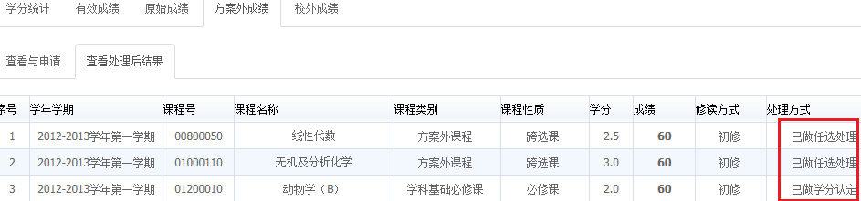 2、處理方式包括:課程置換、任選處理、學分認定。課程置換是指用內容相近且學分一般不低于方案內要求的課程申請置換方案內課程(如將在其他學院修讀的《計算機基礎2》置換為我院的《計算機基礎1》)任選處理是指用與本專業不相關的方案外課程申請作通識選修課處理(如將在其他學院修讀的《化學基礎》做通選處理),但西部實驗班的通識選修課有具體的課程要求,如果在其他學院修的課程不同于西部實驗班培養方案中的課程,則無法做任選處理;學分認定是指當前培養方案內無相應課程,但為同專業其他版本培養方案的同類別課程,則直接按類別認定學分,學分保持不變,學分認定一般只適用于留級導致培養方案有變動的特殊情況。