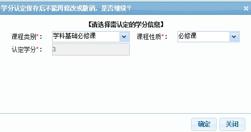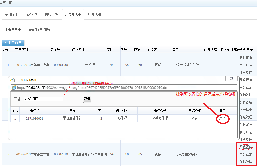 第二步:在方案外成績查詢頁面每門課程后面有“課程置換”、“學分認定”、“任選處理”三種申請處理方式,例如:已修一門課程“思想道德修養與法律基礎”,分數為85,申請置換為方案內的課程“思想道德修養”,則如上圖,點擊“課程置換”按鈕在彈出的頁面查詢到申請替換的課程,然后選擇確定即可。當無對應課程做置換時,可根據實際情況申請進行學分認定或任選處理,點擊后如下圖: