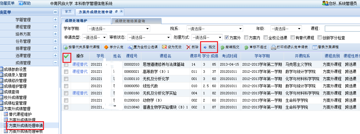 第四步:學生打印申請表后,交所在學院教學秘書于教務系統中處理(法學院2-101辦公室)。教學秘書在教務系統【成績管理】-【方案外成績管理】-【方案外成績處理申請】界面按照處理結果進行相應操作,需提交教務處審核的點擊“提交”按鈕。如下圖:
