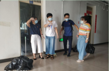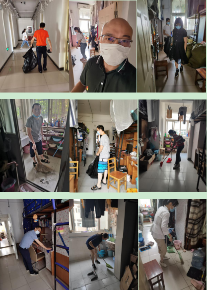 清掃現場老師們忙碌的身影 在對全體老師進行分組安排后,各小組攜帶清掃工具前往各自負責的樓棟。整個清掃活動持續近兩個小時,老師們認真清理地面和桌面,將垃圾桶中的殘留垃圾全部清理完畢,地面清掃干凈。天氣炎熱,老師們干的大汗淋漓,但在他們臉上看到的都是笑容,老師們都表示難得有一次機會參加集體勞動,既為學生們做了點實事,也借此機會深入了解了孩子們課堂以外生活的環境,同時也希望借由老師們的身體力行,能帶動同學們返校后積極勞動,在疫情防控常態化階段,同學們務必要養成良好的個人衛生習慣,保持宿舍干凈整潔,為自己和他人創造良好的學習生活環境。