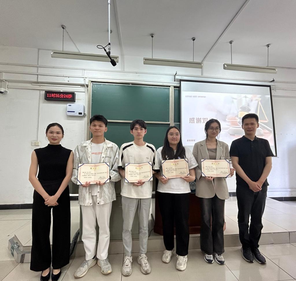 課堂伊始,四位同學結合實際案例,從內容和形式上對真實的勞動合同進行了審查,闡述了自己的審查意見和理由。隨后,針對四位同學的講述,肖律師進行了點評,發表了自己的意見。肖律師談到,同學們能落落大方地站在講臺上,條理清晰地針對案例進行分析,這本身就值得贊賞;學好法律既需要理論知識的汲取,也需要實務經驗的積累,同學們在校期間應利用充足的教學資源,盡可能地學習理論知識,將理論知識融入實踐應用之中。肖律師還結合自己的親身經歷,告訴同學們,法律應該被信仰,作為法律職業者,應該不忘初心,牢記當事人的囑托,熱情服務當事人。其后,楊院長和肖律師一起為同學代表頒發了榮譽證書。