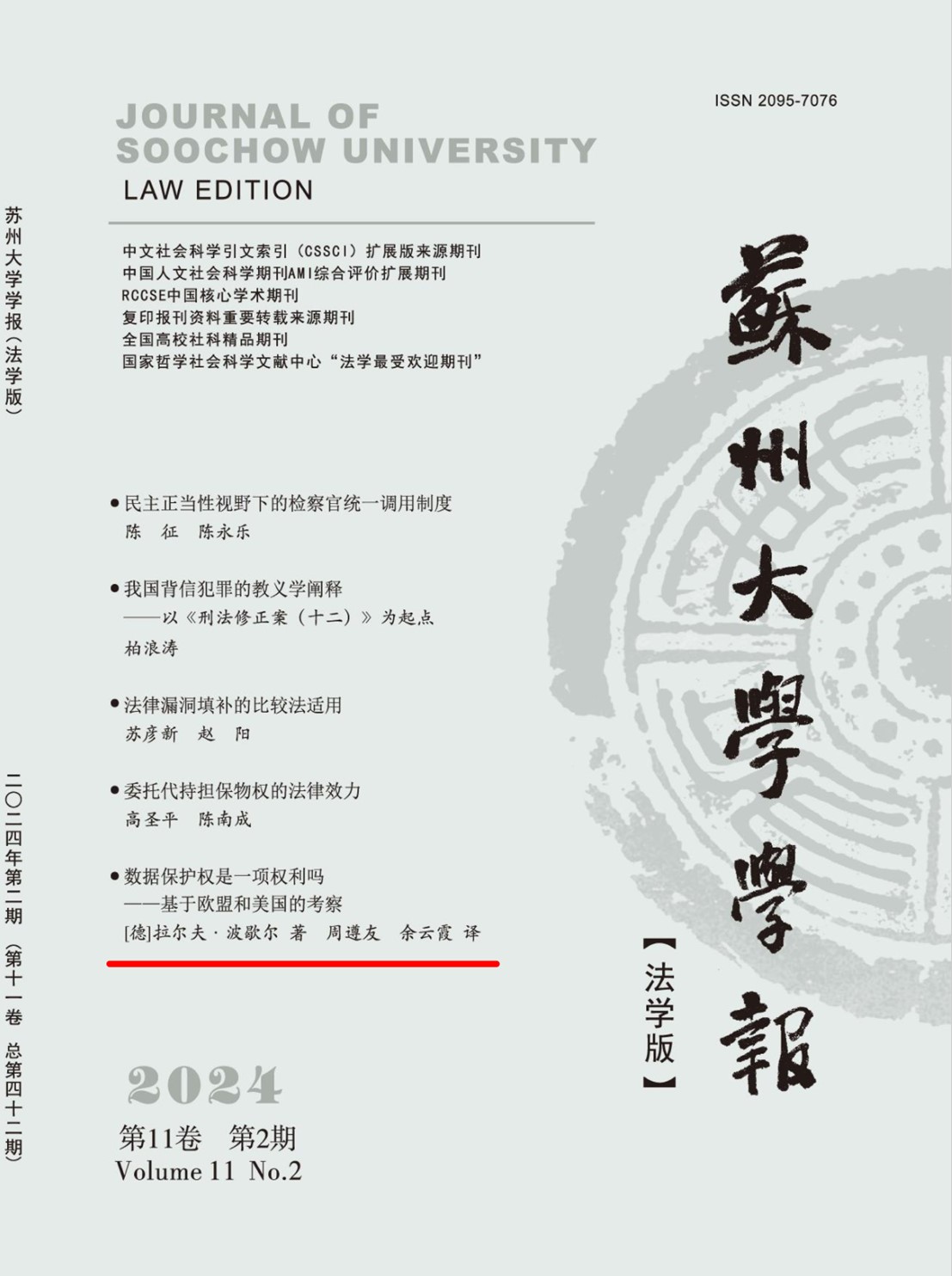 法學(xué)院周遵友教授與其研究生余云霞合譯的學(xué)術(shù)論文《數(shù)據(jù)保護(hù)權(quán)是一項權(quán)利嗎——基于歐盟和美國的考察》(作者:[德]拉爾夫·波歇爾)被《新華文摘》2024年第20期“國外社會科學(xué)”欄目全文轉(zhuǎn)載并被作為封面文章。