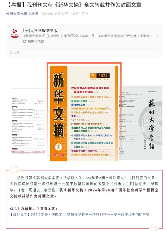 譯文《數(shù)據(jù)保護(hù)權(quán)是一項權(quán)利嗎——基于歐盟和美國的考察》刊發(fā)于《蘇州大學(xué)學(xué)報(法學(xué)版)》2024年第2期,在該文被《新華文摘》2024年第20期全文轉(zhuǎn)載后,《蘇州大學(xué)學(xué)報(法學(xué)版)》在其微信公眾號上發(fā)出喜報進(jìn)行專題報道。