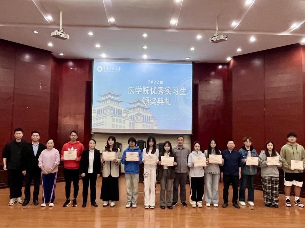隨后,大會進入了激動人心的優秀實習生頒獎環節。八位在實習過程中表現出色的2022 級學生依次走上領獎臺,接受表彰。他們在法院、檢察院、律所等不同的實習崗位上展現出了扎實的專業知識功底、嚴謹的工作態度和出色的實踐能力,贏得了實習單位的認可和好評。臺下的同學們用熱烈的掌聲向他們表示祝賀,眼神中流露著對實習生活的期待。