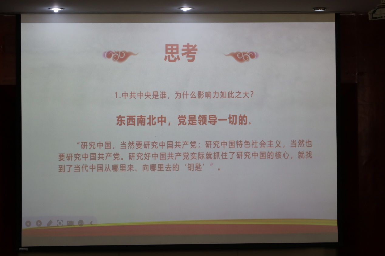 課程伊始,陶恒老師以近期股市暴漲為切入點,突出反映了中國共產(chǎn)黨引領(lǐng)國家經(jīng)濟發(fā)展的強勁動力,體現(xiàn)了中國共產(chǎn)黨把握經(jīng)濟發(fā)展大局、引領(lǐng)市場方向上的高瞻遠矚。隨后,他對一系列具體事例進行分析,強調(diào)我國的大政方針都與黨同呼吸共命運,突出了黨的重要性,并指出我們應(yīng)當(dāng)堅決擁護黨的領(lǐng)導(dǎo),為實現(xiàn)中華民族偉大復(fù)興的中國夢而努力奮斗。