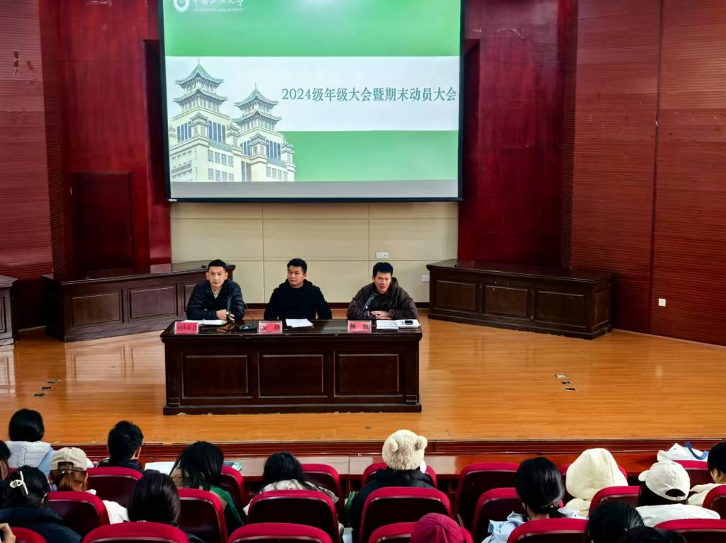 12月20日下午15時,2024級年級大會暨期末動員大會在學院模擬法庭順利舉行,此次會議由24級輔導員阿禾朱力·黑沙老師主持,姜珍副書記及楊帆副院長出席并發表講話,歡迎即將轉專業到來的同學們,并為法學專業學生的期末學習工作與成長規劃指明方向。