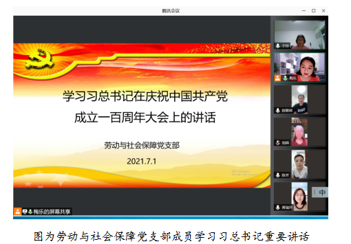 2021年7月1日上午,慶祝中國共產(chǎn)黨成立100周年大會(huì)在北京天安門廣場隆重舉行,勞動(dòng)與社會(huì)保障黨支部成員在15號(hào)樓839室集中觀看了大會(huì)直播,共同迎接中國共產(chǎn)黨百年華誕。7月1日晚上7點(diǎn),勞動(dòng)與社會(huì)保障黨支部通過騰訊會(huì)議,組織支部成員進(jìn)一步認(rèn)真學(xué)習(xí)習(xí)近平總書記在慶祝中國共產(chǎn)黨成立100周年大會(huì)上的重要講話。