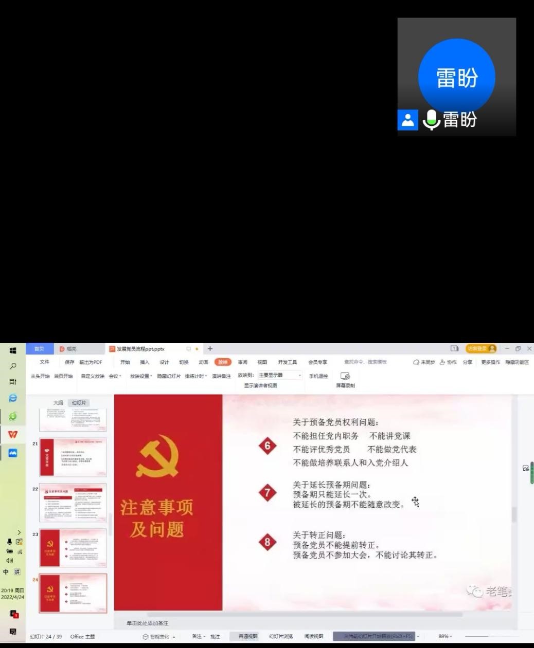 接下來(lái),雷盼老師帶領(lǐng)同學(xué)們學(xué)習(xí)“入黨流程的注意事項(xiàng)及問(wèn)題”。雷老師先后向同學(xué)們闡述了“發(fā)展黨員的原則和紀(jì)律”和“預(yù)備黨員的權(quán)利問(wèn)題”。在“發(fā)展黨員的紀(jì)律與原則”部分,雷老師著重強(qiáng)調(diào)了政治審查的重要性和堅(jiān)持“七個(gè)不發(fā)展”原則。“預(yù)備黨員的權(quán)利問(wèn)題”部分,雷老師提醒同學(xué)們“預(yù)備黨員是不能擔(dān)任培養(yǎng)聯(lián)系人和入黨介紹人的”,囑咐同學(xué)們要注意這個(gè)點(diǎn)。