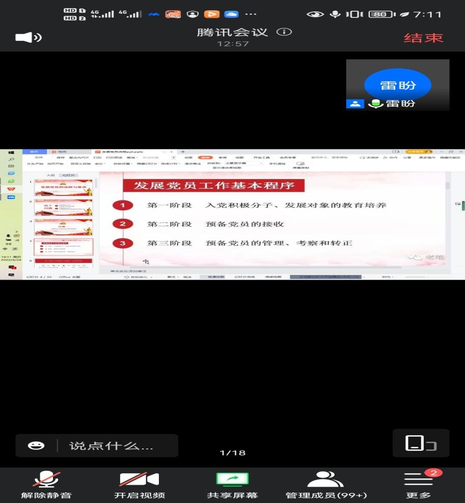 第二講授課于19點(diǎn)05分正式開(kāi)始,主講人雷盼老師用PPT帶大家一起學(xué)習(xí)“發(fā)展黨員的程序與要求”。雷老師首先給同學(xué)們介紹了入黨流程的四個(gè)階段。即“入黨積極分子、發(fā)展對(duì)象的教育培養(yǎng)”、“發(fā)展對(duì)象的培訓(xùn)流程”、“預(yù)備黨員的接收”、“預(yù)備黨員的管理、考察與轉(zhuǎn)正”這四個(gè)階段。其中,雷盼老師給同學(xué)們強(qiáng)調(diào)了培養(yǎng)年限的要求,帶領(lǐng)同學(xué)們一起分析了“培養(yǎng)聯(lián)系人”和“入黨介紹人”的區(qū)別,讓同學(xué)們對(duì)入黨流程的基本知識(shí)有一定掌握。