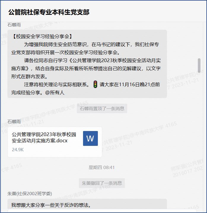 為增強(qiáng)黨支部同志們的安全防范意識,學(xué)校的相關(guān)工作安排,按照《公共管理學(xué)院2023年秋季校園安全活動月實(shí)施方案》,我院勞動與社會保障本科生黨支部于11月14日-11月16日積極組織開展了校園安全學(xué)習(xí)經(jīng)驗(yàn)分享會,支部全體黨員參加會議。
