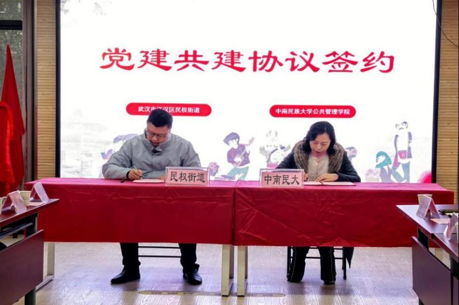為持續深化校地黨建合作,進一步鑄牢中華民族共同體意識,2024年12月10日下午,由院黨委書記馬國杰、院長彭慶軍帶隊,我院師生一行13人赴武漢市江漢區民權街參加“中華民族一家親 同心共筑中國夢”主題活動,簽訂中南民族大學公共管理學院與武漢市江漢區民權街道黨建共建協議,并舉行“鑄牢中華民族共同體意識工作站”揭牌儀式。