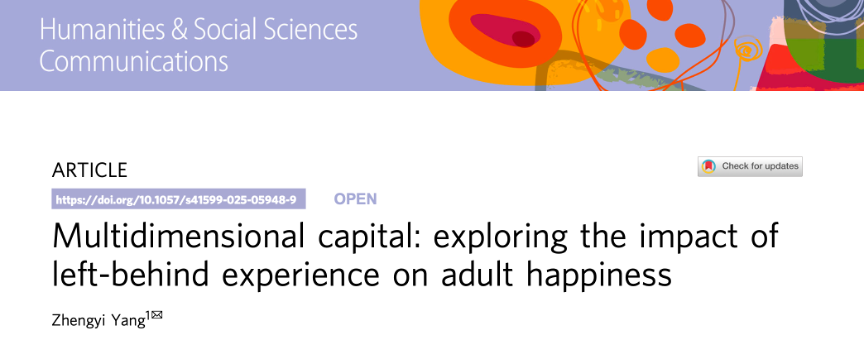 國際知名期刊《人文社科通訊》(Humanities & Social Sciences Communications)在線發表了我校國家安全學院課題組在童年留守經歷與成年幸福感方面的最新成果。論文題為Multidimensional capital: Exploring the impact of left-behind experience on adult happiness(原文鏈接:https://doi.org/10.1057/s41599-025-05948-9)。國家安全學院楊政怡副教授為論文獨立作者,我校為唯一署名單位。