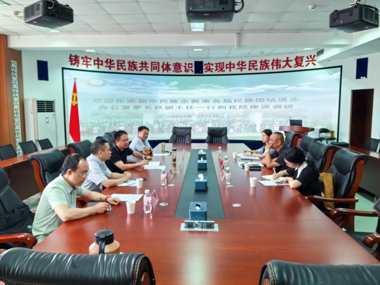 7月11日下午,張家界市民宗局民族團結進步辦公室副主任羅長躍、專干謝京珊、劉宓到我院座談調研。院黨總支書記賀展、副院長李學保、教授崔榕,校黨委宣傳部副部長楊征參加座談。座談會由賀展主持。