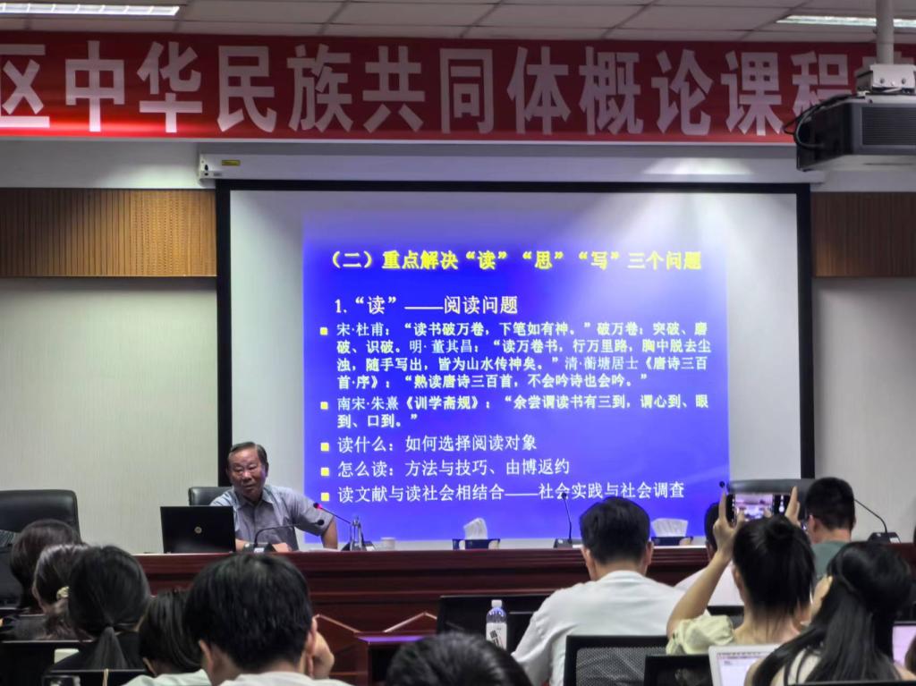 2024年9月27日晚,中南民族大學國務(wù)院政府特殊津貼者,國家民委首屆突出貢獻專家、湖北省學科帶頭人、博士研究生導師雷振揚教授在“澤霖講堂”為我院2023和2024級碩士、博士研究生做了一場題為“中華民族共同體學院研究生專業(yè)研習應(yīng)注意的幾個問題”的學術(shù)講座。副院長李學保教授主持學術(shù)講座。