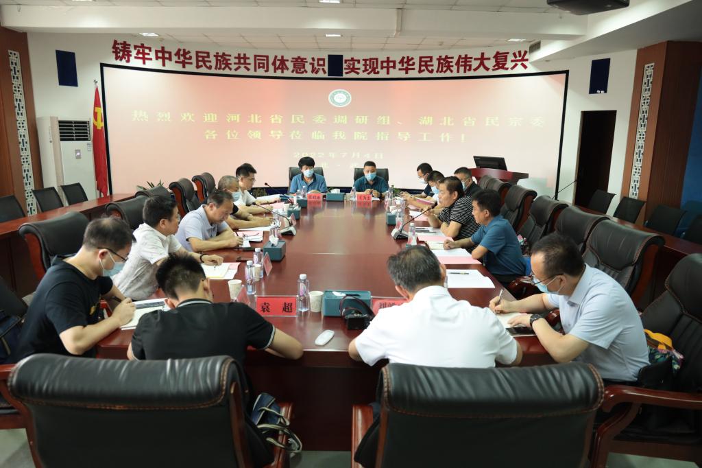 7月4日上午,河北省民委調研組一行9人在文化教育科技處處長耿棟良帶領下,來我校調研開展鑄牢中華民族共同體意識教育的經驗做法,并在我院舉行調研座談。湖北省民宗委民族二處二級調研員郭用德等陪同調研。校黨委宣傳部、黨委學生工作部相關負責人,我院領導班子成員參加調研座談。座談會由我院黨總支書記湯振華主持。