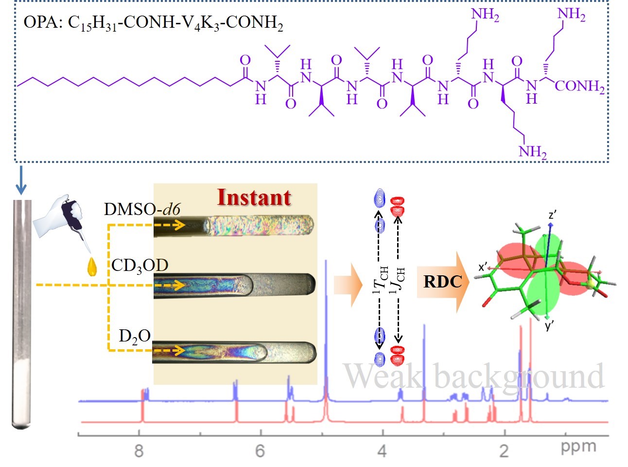 近日,我院張愛清教授團隊與藥學院雷新響教授團隊合作,報道了一種多溶劑相容液晶介質用于有機分子的殘留偶極耦合測量,相關研究成果以 “Measurement of Residual Dipolar Couplings of Organic Molecules in Multiple Solvent Systems using a Liquid Crystalline based Medium” 為題,發表在《德國應用化學》(Angew. Chem. Int. Ed. 10.1002/anie.202007243) 雜志上。秦四勇老師為本論文第一作者和通訊作者,雷新響教授為本論文的共同通訊作者。 有機分子結構的鑒定,特別是涉及立體化學的解析一直是分子科學和藥物化學的核心任務之一。核磁共振波譜(NMR)在有機分子結構分析與鑒定方面表現出舉足輕重的作用。其中,殘留偶極耦合(residual dipolar coupling,RDC)反映原子間的距離及其與外磁場之間的角度關系,可構建分子的三維結構,在分子構型及優勢構象等方面的解析中具有廣泛應用。然而,有效獲取分析底物的RDC,需使分子的運動受限或誘導其產生各向異性,從而產生“殘留偶極耦合”。同時,偶極耦合作用不宜過強,方可獲得線寬較窄的圖譜,從而獲取準確的RDC值。因此,構建結構新穎、簡便實用的定向程度可控的介質,實現RDC的精確測定具有重要意義。 目前,用于RDC提取的定向介質主要有聚合物凝膠、高分子液晶等。基于聚合物制備的定向介質,制備過程一般較為繁瑣,時間長,需專業操作,離實驗室常規應用仍存在挑戰。該研究工作設計了一種新型兩親性小分子肽,自組裝構建多溶劑相容的液晶介質,可簡單、快速的用于有機分子殘留偶極耦合的準確測量。通過固相有機合成技術,合成制備了兩親性小分子肽C15H31-CONH-VVVVKKK-CONH2 (OPA),在三種溶劑(二甲亞砜、甲醇、水)中均能自組裝快速形成溶致液晶介質。進一步選擇具有不同生物活性和溶解性差異的7種有機分子(赤霉素、雷公藤甲素、山道年、石杉堿甲、冬凌草甲素、雌酮和脯氨酸)作為模型,考查了小分子肽自組裝液晶對其定向性能,7種分子都獲得了準確的RDCs值。實驗結果表明,小分子肽自組裝液晶具有以下優點:1可用于溶解性能不同的有機分子RDC的測定,顯著擴大了被測分子的范圍;2)小分子肽液晶作為定向介質背景微弱,有效避免了普通介質背景峰對RDC分析的干擾;3)形成液晶的方式簡單、快速,不需要超聲等外界條件誘導;4)液晶對溫度、超聲等穩定,同時在數周內保持均質性,方便于隨時取用;5)肽的純度對有序介質的形成影響不大,可直接用粗肽制備相關液晶用于有機分子的檢測,其制備簡單,可實現批量生產。為有機分子及天然產物的殘留偶極耦合測定提供了新方案,具有廣闊的應用前景。