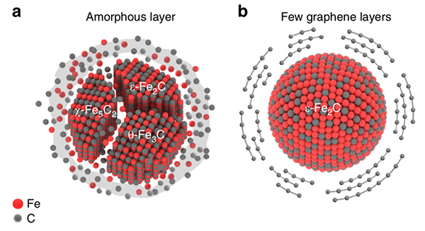 該團(tuán)隊(duì)于2014年就開(kāi)展了鐵基費(fèi)-托合成催化劑的活性相調(diào)控的研究工作。經(jīng)過(guò)多年的努力,他們成功設(shè)計(jì)合成了一種石墨烯層包裹限域的ε-Fe2C納米材料,這種納米材料在工業(yè)費(fèi)-托合成條件下具有優(yōu)異的活性和穩(wěn)定性,是迄今為止文獻(xiàn)報(bào)道的活性最高的鐵基費(fèi)-托合成催化劑。進(jìn)一步的研究表明,這種納米材料中的ε-Fe2C物相在高溫下能保持穩(wěn)定存在,實(shí)驗(yàn)和量子化學(xué)理論計(jì)算研究證明石墨烯包裹層有助于抑制ε-Fe2C在高溫下的相變和積碳。