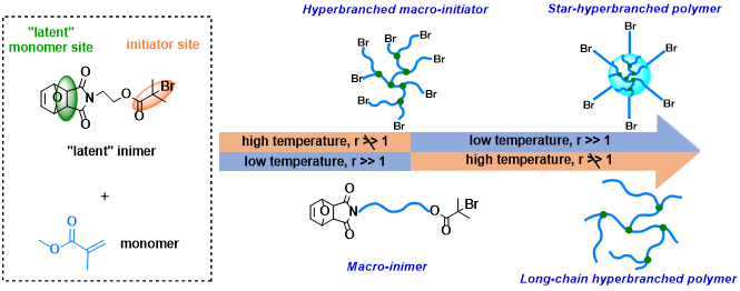 圖1.Diels-Alder動態(tài)化學(xué)可控制備策略(a)和通過反應(yīng)溫度和原料的立體化學(xué)結(jié)構(gòu)調(diào)控超支化聚合產(chǎn)物拓撲結(jié)構(gòu)(b)的原理圖.