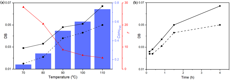 圖2.轉(zhuǎn)化率、聚合速率比r、理論支化度(虛線)和實際支化度(實線)隨反應(yīng)溫度的變化曲線(a)以及理論支化度(虛線)和實際支化度(實線)隨反應(yīng)時間的變化曲線(b).