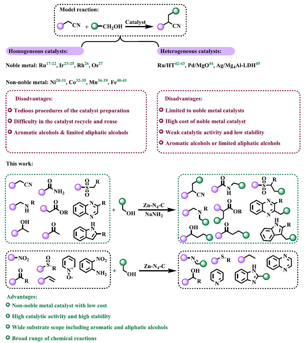 α-烷基化腈是構建羧酸衍生物、胺、酮、噁唑啉和許多生物活性分子的結構單元。采用“借氫策略”,通過活化醇α-Csp3-H鍵和腈α-Csp3-H鍵構建α-烷基化腈類化合物是一種原子經濟且環境友好的方法,產生的副產物只有水。該論文報道了ZIF-8熱解制備的具有Zn-N4結構的單原子Zn催化劑,用于腈與生物質醇的α-烷基化反應,該催化劑還可以廣泛應用于酮、醇、N-雜環、酰胺、酮酸和酯的C-烷基化,胺和酰胺的N-烷基化反應,以及多種氫轉移還原反應。這是首例使用生物質衍生醇作為烷基化試劑和氫供體進行各種有機轉化的高效單原子催化劑。