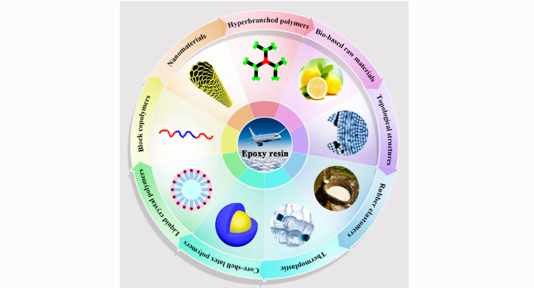 環氧樹脂(EPs)已廣泛應用于涂料、膠粘劑、半導體封裝材料、電氣絕緣材料、高性能復合材料等領域。然而,EPs抗疲勞性能差、抗沖擊強度低、韌性與強度難以同時提高以及回收困難等局限性嚴重阻礙了其可持續發展及在高技術領域的應用。近年來,科學家們對環氧樹脂的增韌改性和增韌機理進行了大量研究,張道洪教授團隊對其進行了系統總結和分析,重點介紹了環氧樹脂的增韌方法,從傳統的直接加入橡膠(REs)、熱塑性塑料(TPs)、核殼聚合物(CSPs)、液晶聚合物(LCPs)、嵌段共聚物(BCPs)和納米材料(NMs),到引入超支化聚合物(HBPs)、生物基材料(BBMs)和構筑交聯網絡拓撲結構(TSs)(圖1)。分析了環氧樹脂的兩相增韌機理和均相增韌機理,其中超支化聚合物,尤其是超支化環氧樹脂(HERs),因其良好的相容性、低粘度、流體力學體積小和分子鏈間纏結密度低等優點,可有效同時均相增強增韌環氧樹脂,近十年受到該領域的特別青睞;同時也概括了環氧樹脂及其復合材料韌性的分析表征技術。最后對環氧樹脂在合成與應用領域存在的挑戰進行了展望,為環氧樹脂在高新技術領域的可持續發展提供了指導。