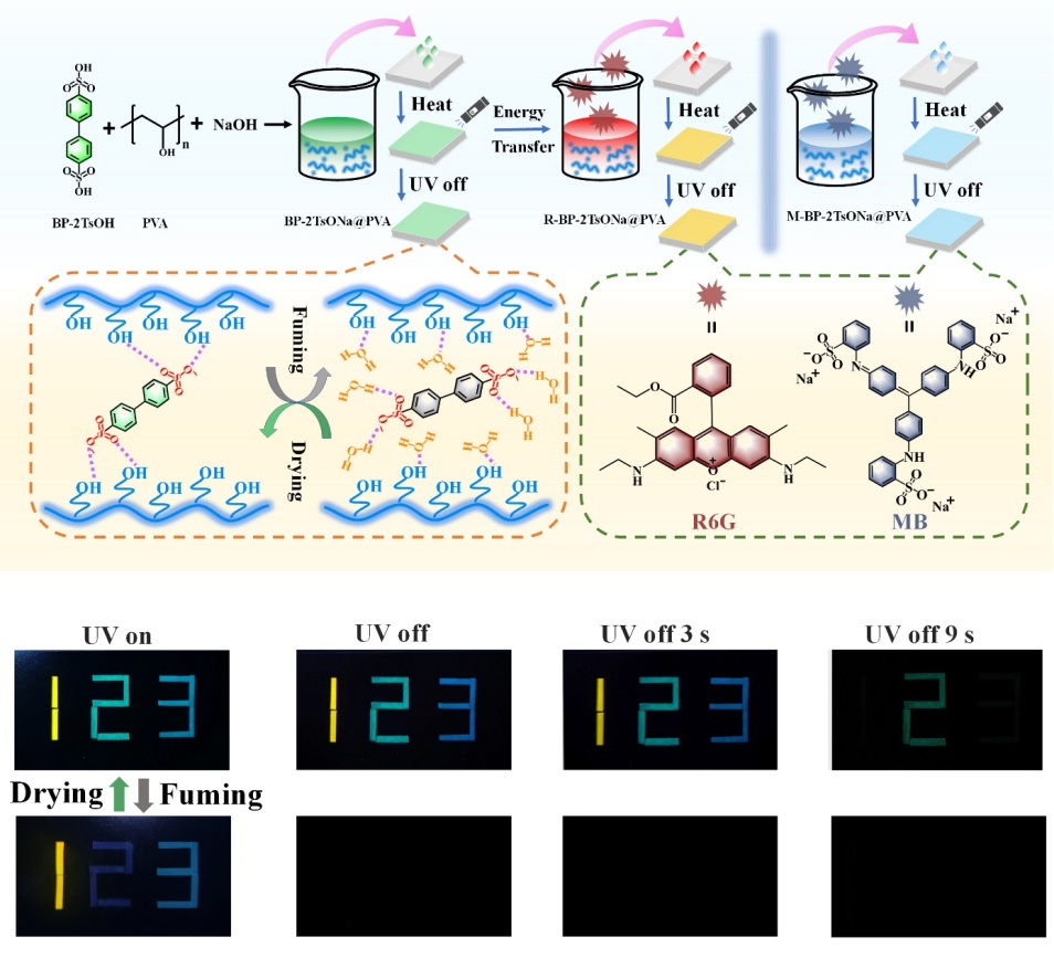 本文提出一種可持續策略,僅通過水性加工即可實現水/熱響應性RTP及顏色可調的可回收超長室溫磷光聚合物材料。通過氫鍵將聯苯 - 4,4'- 二磺酸(BP-2TsOH)連接到聚乙烯醇(PVA)基質中,制備的聚合物薄膜展現優異的 RTP 性能,包括長余輝(2.489 ms)和高量子產率(66.42%)。暴露于水蒸氣通過破壞剛性氫鍵網絡猝滅磷光,而 80°C 加熱去除水分子并通過形成氫鍵網絡恢復發射,證明了發光的動態、可重復開關。基質內的氫鍵增強了機械強度,而其水介導的可逆性賦予了刺激響應性和自修復能力。這種可逆性還允許通過水處理修復機械損傷,實現綠色回收并避免環境污染。最后,這些薄膜成功應用于數字加密、解密和信息防偽等方面,表明其在安全信息存儲和傳輸中具有巨大實用潛力。