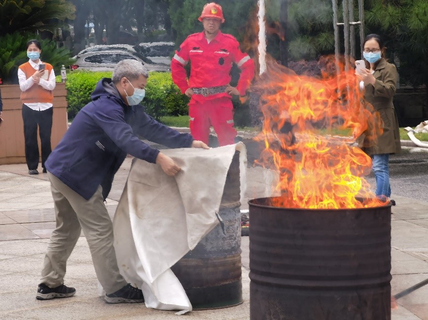 在消防安全演練環節,技術人員現場講解和演示了滅火器和滅火毯的使用要點,指導大家掌握使用滅火器和滅火毯的正確方法。