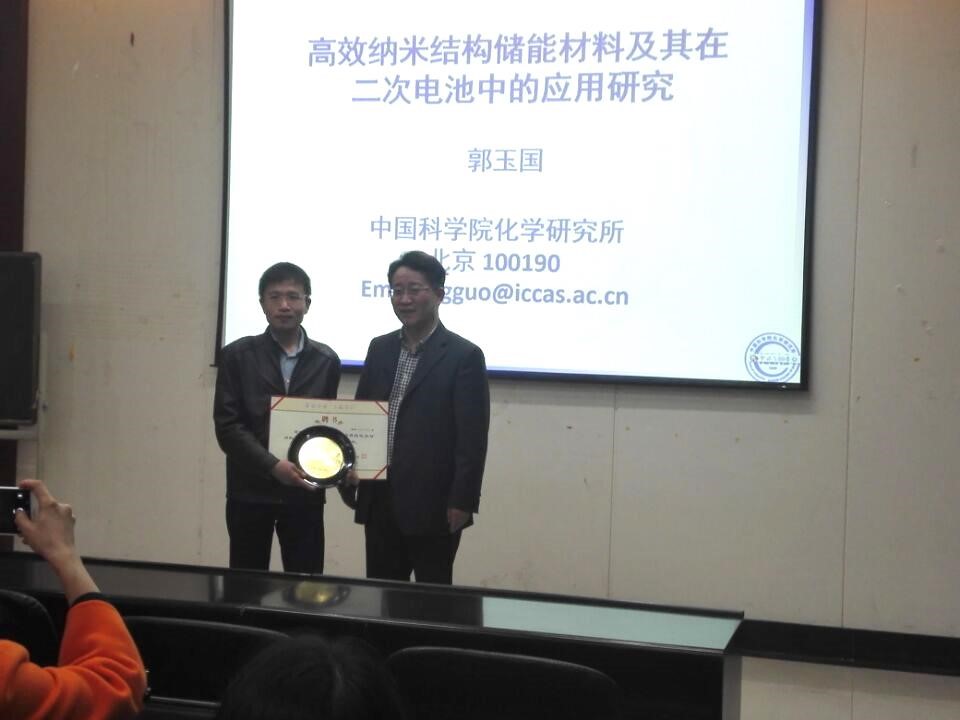 儀式結束后,郭教授為校師生作了題為“高效納米結構儲能材料及其在二次電池中的應用研究”的學術報告。郭教授介紹了二次電池的發展趨勢和鋰電池的工作原理,引申出納米結構材料在高能量密度、長循環壽命和安全可靠性電池應用中的優勢和不足,指出構造微/納米分級結構、納米碳表面包覆等策略可提高納米材料的電化學性能,并著重介紹了課題組在鋰-硫電池、SEI層調控、鋰電用聚合物電解質等領域的杰出工作。報告結束后,郭教授仔細回答了在座師生的問題,并就鋰電池在新能源汽車領域的應用、固態電解質設計合成等方面進行了討論和交流。