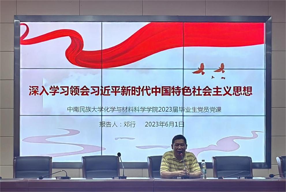 | 為扎實(shí)推進(jìn)學(xué)習(xí)貫徹習(xí)近平新時(shí)代中國(guó)特色社會(huì)主義思想主題教育工作,做到理論學(xué)習(xí)與解決思想問(wèn)題相結(jié)合,使廣大黨員牢固樹(shù)立黨員意識(shí)、宗旨意識(shí),保持黨員的先進(jìn)性純潔性,加強(qiáng)畢業(yè)生黨員的離校教育,6月1日晚,化材學(xué)院黨委在學(xué)院大會(huì)議室為2023屆畢業(yè)生黨員上最后一堂黨課。 100多位即將畢業(yè)的本科生、研究生黨員在黨委副書(shū)記錢(qián)紅亮的帶領(lǐng)下,重溫入黨誓詞。 學(xué)院黨委書(shū)記鄧行為畢業(yè)生黨員作《深入學(xué)習(xí)習(xí)近平新時(shí)代中國(guó)特色社會(huì)主義思想,掌握好、堅(jiān)持好、運(yùn)用好貫穿其中的立場(chǎng)觀點(diǎn)方法》的輔導(dǎo)報(bào)告。鄧行介紹了習(xí)近平新時(shí)代中國(guó)特色社會(huì)主義思想創(chuàng)立、發(fā)展的脈絡(luò)。他強(qiáng)調(diào),廣大黨員要以高度的政治責(zé)任感堅(jiān)決擁護(hù)“兩個(gè)確立”,增強(qiáng)“四個(gè)意識(shí)”、堅(jiān)定“四個(gè)自信”、做到“兩個(gè)維護(hù)”,自覺(jué)在思想上政治上行動(dòng)上同以習(xí)近平同志為核心的黨中央保持高度一致。 鄧行給畢業(yè)生黨員提出了加強(qiáng)理論學(xué)習(xí),堅(jiān)定理想信念;增強(qiáng)黨員意識(shí),做合格黨員;強(qiáng)化作風(fēng)建設(shè),遵守黨紀(jì)黨規(guī);踐行黨的宗旨,積極服務(wù)人民等四點(diǎn)希望,并勉勵(lì)畢業(yè)生黨員,在今后的學(xué)習(xí)工作中,要踏實(shí)肯干,開(kāi)拓創(chuàng)新,在新時(shí)代新征程中,為實(shí)現(xiàn)中華民族的偉大復(fù)興貢獻(xiàn)自己的力量。