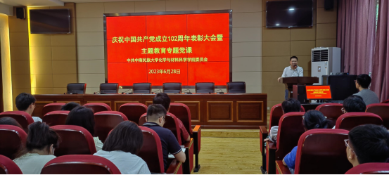 為慶祝中國共產黨成立102周年,深入開展學習貫徹習近平新時代中國特色社會主義思想主題教育,表彰先進、弘揚正氣,動員和激勵學院廣大黨員踔厲奮發、勇毅前行,為學校和學院事業發展作出更大貢獻,6月28日下午,化材學院黨委于化材樓109會議室召開“兩優一先”表彰大會,舉辦主題教育專題黨課。學院在校師生黨員參加會議。會議由院黨委副書記錢紅亮主持。
