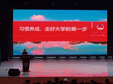 在年級大會上,張雪花老師以“習慣養成,走好大學的第一步”為主題,為新同學介紹了學校以及學院的教育教學管理制度,接著從“愛學習”“自律自立”“獨立思考”“知行合一”四個方面具體講述了該如何養成大學生優秀的學習和生活習慣。