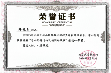 近日,國家民委《中華民族共同體概論》優質課程資源征集工作結果揭曉。我院教師韓曉樂副教授主講的《總書記講過的民族團結故事》專題榮獲優秀教輔視頻一等獎。