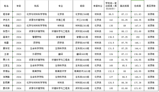 說明:以上結果還需經過學校審核,最終錄取以學校審核結果為準。公示期為2024年11月27日--2024年11月29日。公示期內如有異議,請聯系孫老師,電話:027-67840955,郵箱:55896751@qq.com.地址:化學與材料科學學院7號樓112辦公室。