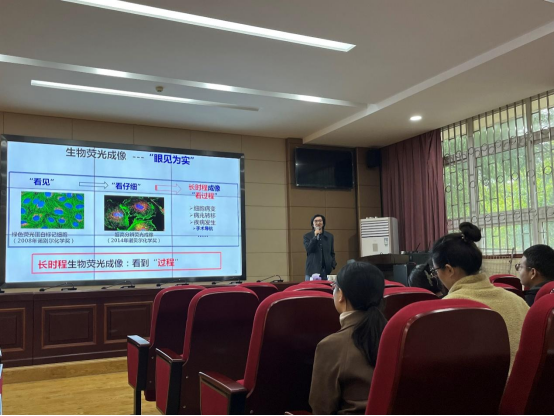 何耀教授首先介紹了長(zhǎng)時(shí)程生物熒光成像對(duì)熒光探針領(lǐng)域發(fā)展至今的重要意義,由于一般探針的光漂白性等性質(zhì)使得其發(fā)光時(shí)間短,因此,迫切需要發(fā)展毒性低、光學(xué)穩(wěn)定的熒光探針。而長(zhǎng)時(shí)間成像可以“看過程”,看到細(xì)胞病變、病兆轉(zhuǎn)移以及疾病發(fā)生,有十分巨大的應(yīng)用前景。長(zhǎng)時(shí)程熒光成像的必要條件是:熒光信號(hào)強(qiáng)且穩(wěn)定、生物相容性好,何耀教授課題組通過將蛋白質(zhì)等特定生物活性分子通過偶聯(lián)等方式修飾在硅基納米顆粒上實(shí)現(xiàn)對(duì)腫瘤細(xì)胞的特異性識(shí)別并長(zhǎng)時(shí)間記錄一個(gè)細(xì)胞的變化。緊接著,何耀教授講述了其課題組自成立以來圍繞著硅基探針及其生物成像分析與生化傳感檢測(cè)所開展的系統(tǒng)研究工作。主要包括:1)硅基探針在腫瘤細(xì)胞中的生物成像;2)硅基探針在眼部疾病中的應(yīng)用;3)硅表面增強(qiáng)拉曼光譜比率芯片。并將其研究成果與臨床聯(lián)系,實(shí)現(xiàn)了多學(xué)科交叉。報(bào)告結(jié)束后,何耀教授與在座師生就硅基探針如何靶向腫瘤細(xì)胞以及在眼部疾病中的應(yīng)用及原理等方面進(jìn)行了討論和交流。
