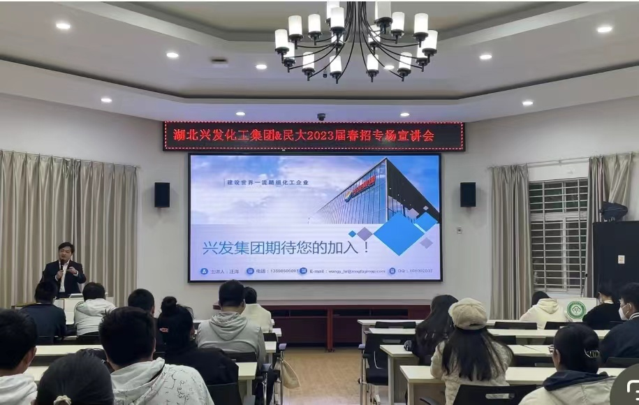 此次招聘會經校友聯絡開展。招聘會上,汪洋先生結合PPT向同學們介紹了湖北興發化工集團股份有限公司的基本情況,興發集團是國有企業,也是全國最大的精細磷化工企業和三峽庫區最大的移民遷建企業,公司位居中國企業前500強。目前興發集團有1家上市公司和多家子公司、參股聯營公司,公司在內蒙古、江蘇、重慶多地建立了規模化生產基地,興發集團與寶潔、聯合利華等公司均有合作。公司開發食品級、醫藥級、電子級各類產品,形成了“資源能源為基礎、精細化工為主導、關聯產業相配套”的良好發展格局。