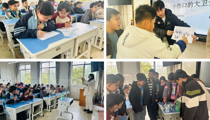 圖1.黎永秀老師進行活動介紹 在本次活動中,隊員們和五年級(1)班的同學們一起完成“VC”(維生素C)密信實驗。團隊成員給小朋友們講解了“VC”密信的原理,邀請小朋友們通過互通密信游戲環(huán)節(jié)親自動手制作VC密信,并講解了碘伏消毒的原理。 在探索“神奇的表面活性劑”的過程中,成員們設計了三個有趣的實驗---紙片魚的比賽、漂亮的牛奶畫和去污實驗,讓小朋友們能夠更加清楚的了解表面活性劑在生活中的作用。同時,帶領同學們學習七步洗手法,教會他們如何更加有效預防病毒感染。