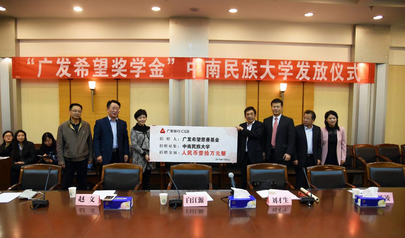 據悉,“廣發希望獎學金”由廣發銀行與中國青少年發展基金會合作設立,旨在幫助民族地區和少數民族大學生順利完成學業,促進民族地區教育及經濟社會發展。我校自2012年成為扶持對象后,每年都會收到獎學金10萬元,用于獎勵品學兼優、家庭困難的在校大學生。