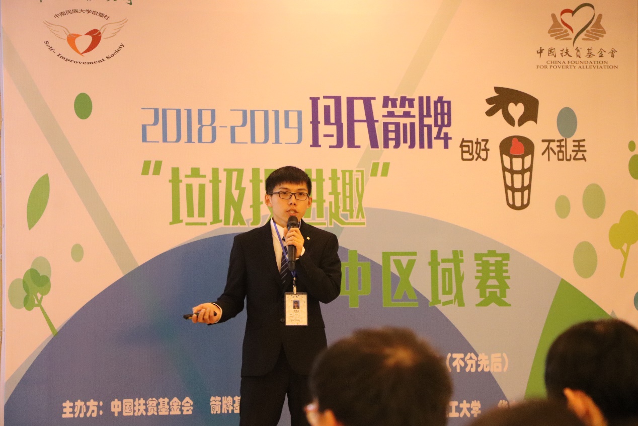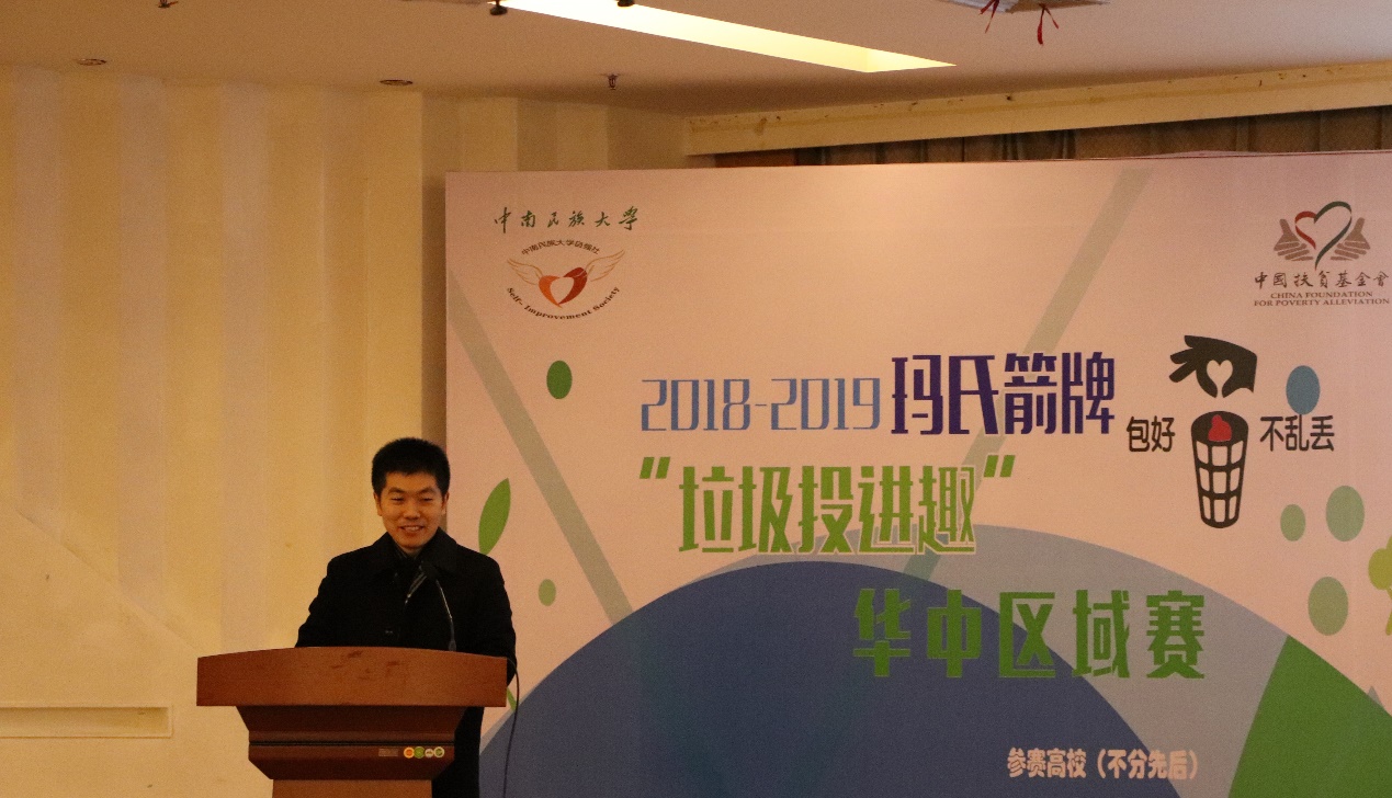 12月9日上午8:30,由中國扶貧基金會和箭牌基金會共同主辦、新長城中南民族大學(xué)自強社承辦的2018-2019箭牌“垃圾投進趣”項目全國青年公益實踐大賽華中地區(qū)區(qū)域賽在中南民族大學(xué)潤良報告廳順利舉行。中國扶貧基金會新長城項目部石天然、上海慈慧公益基金會張弘、華中農(nóng)業(yè)大學(xué)學(xué)生資助管理中心孫倩茹、校學(xué)生工作部(處)副部長魏大江、創(chuàng)新創(chuàng)業(yè)學(xué)院副院長楊海健、文學(xué)與新聞傳播學(xué)院副教授祝翔、資源與環(huán)境學(xué)院副教授陳英明、美術(shù)學(xué)院講師王志勇出席并擔(dān)任大賽評委。