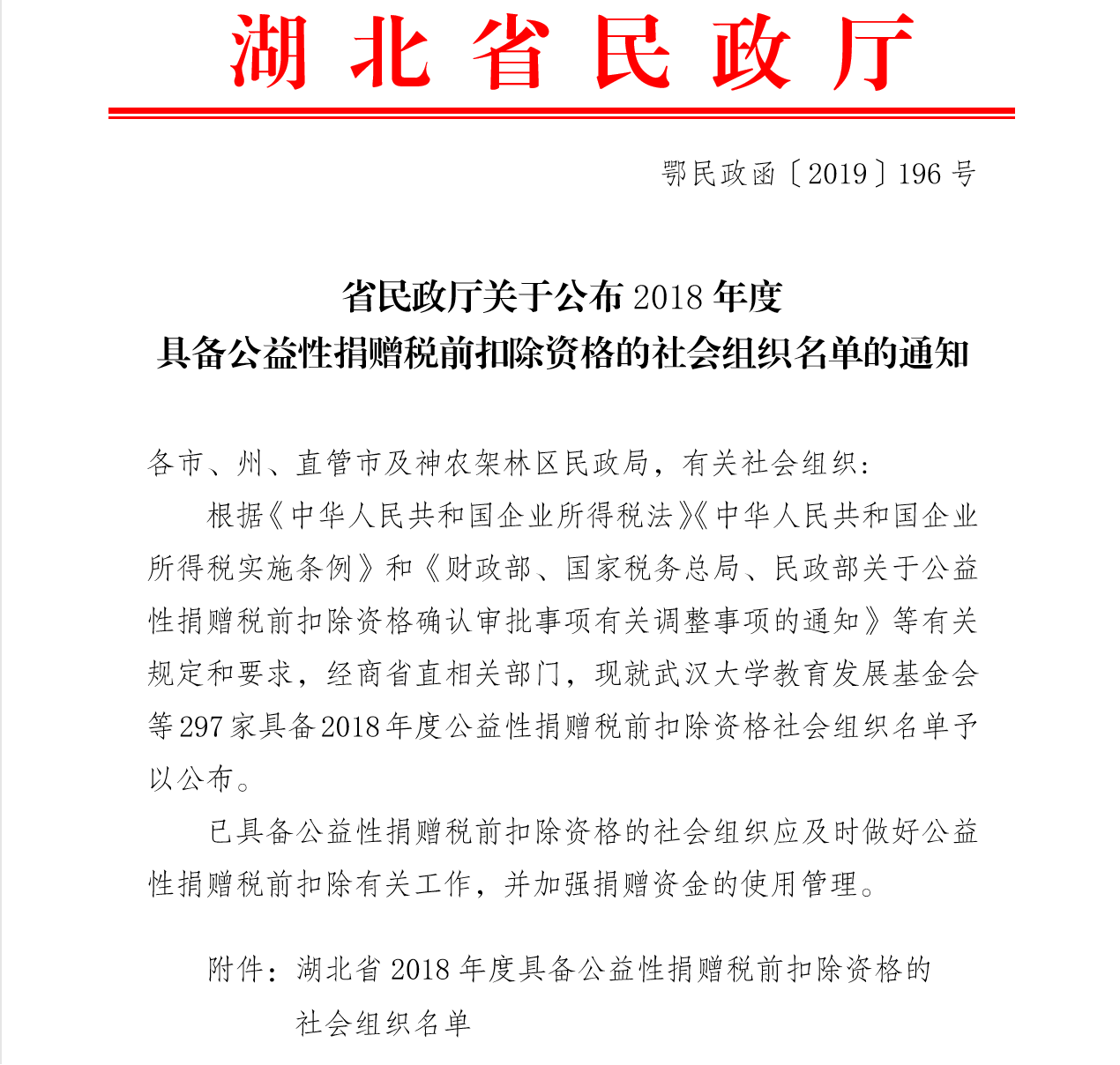 關(guān)于公布2018年度獲得公益性捐贈(zèng)稅前扣除資格的公益性社會(huì)團(tuán)體名單的通知
