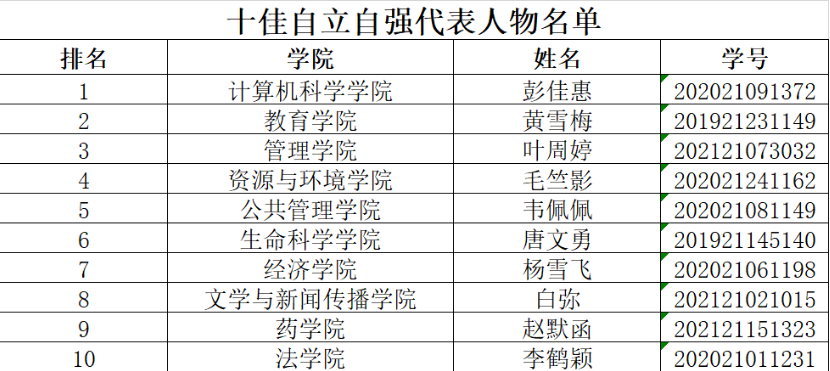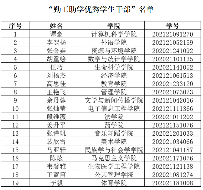 根據《中南民族大學勤工助學管理辦法(民大發〔2019〕44號》有關規定,勤工助學指導中心近期開展了勤工助學評優評先工作。經用工單位推薦,勤工助學指導中心組織推選,擬評選“勤工助學先進集體”7個,“十佳自立自強代表人物”10名,“勤工助學先進個人”71名,“勤工助學優秀學生干部”19名。現將結果公示如下,如有異議,請于三天之內向勤工助學指導中心反映,聯系方式:中南民大勤工助學(QQ:2377175805)