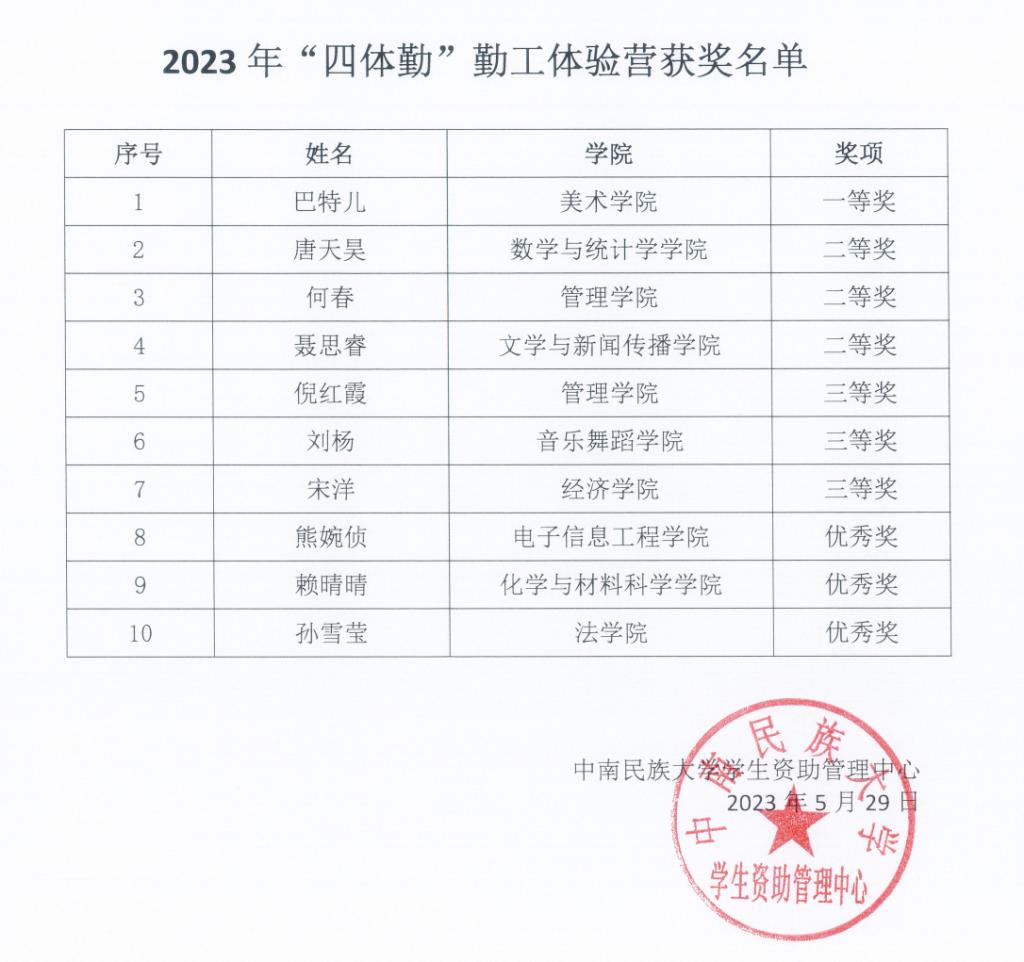 “四體勤”勤工體驗營:一等獎1名,二等獎3名,三等獎3名,優(yōu)秀獎3名;