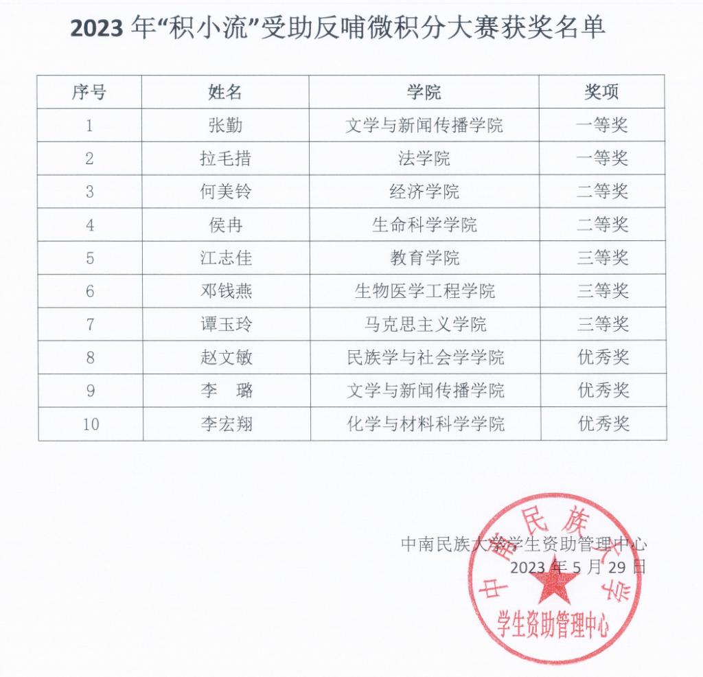“積小流”受助反哺微積分大賽:一等獎2名,二等獎2名,三等獎3名,優(yōu)秀獎3名;