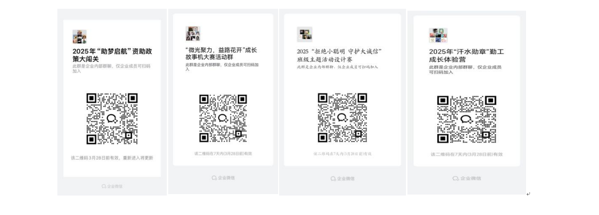 自主報名學生加入企業微信群,填寫報名表即可。各學院要在獲得過國家獎助學金、學校暖心幫扶、各類社會資助的學生及享受過基層就業或參軍入伍代償政策福利的學生中積極宣傳、廣泛動員,3月27日17:00前至少推薦5名在校生參賽,將《“助夢啟航”資助政策大闖關推薦表》(附件1)發送至郵箱:xszz@scuec.edu.cn,并通知參賽學生掃碼加入企業微信群(群二維碼附后)。