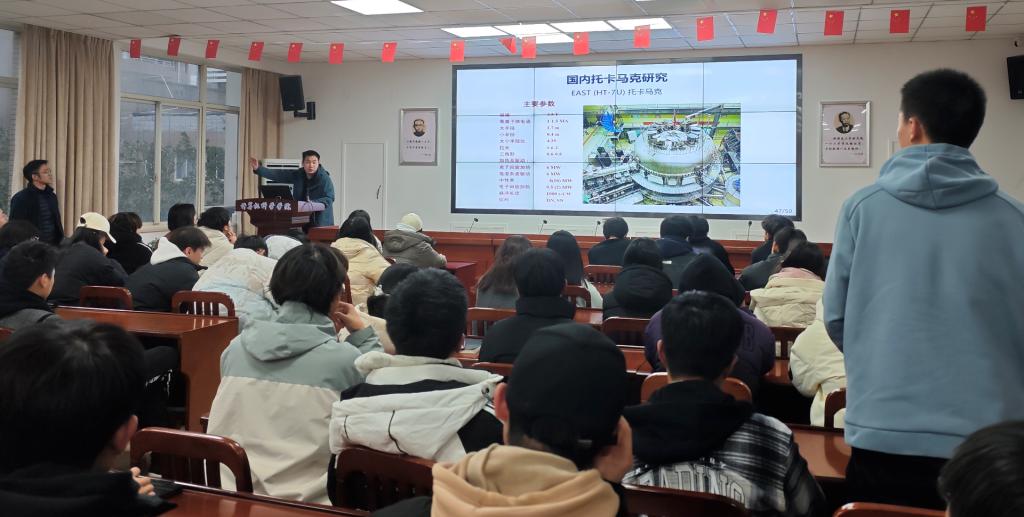 科普報告環節,田雙雙老師以“‘雙碳’形勢下氣體絕緣輸配電裝備環保替代技術”為題,圍繞當前綠色電工裝備發展要求,針對氣體絕緣設備中大量使用的溫室氣體SF6替代技術,從研究背景、技術要求、研究方法、研究進展以及國內外發展趨勢等方面進行了科普,讓同學們了解到了在碳達峰、碳中和的大背景下,電氣設備中廣泛使用的SF6被環保氣體替代的技術方案的最新成果。黃卓老師以“‘人造太陽’中的等離子體原理”為題,回顧磁約束聚變的發展歷程,展望核聚變實現商業發電的愿景和面臨的挑戰。不僅講述了為獲得清潔、可持續的能源,發展可控核聚變的必要性和可行性,而且聚焦于高溫等離子體在磁約束聚變中的應用,特別是如何通過強磁場避免等離子體的散逸和提高等離子體的不穩定性。在講座中,黃老師講述了自己的研究感悟:“人生積蓄著無窮無盡的能量,就像一滴海水,每一個人都蘊藏著巨大的能量,關鍵是如何引爆你人生的潛能,釋放,燃燒!這就是人生的可控聚變,每個人都可以成為偉大的光源,照亮他人和世界。”給了同學們很大的激勵。
