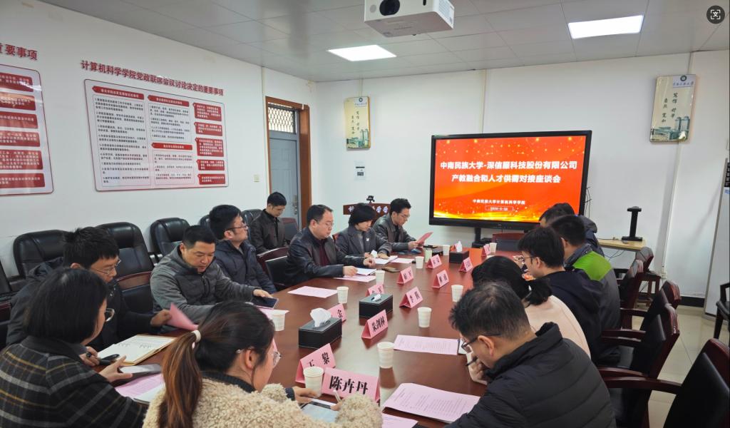 3月20日,深信服科技股份有限公司全國招聘總監柳南、校園招聘總監李騰、華中區人力資源總監王定濤一行到訪中南民族大學計算機科學學院,圍繞深化產教融合、促進校企人才精準對接等議題展開座談交流。計算機科學學院院長帖軍、招生就業處副處長朱軍、數學與統計學院黨委副書記宋榮、副院長夏永波、計算機科學學院副院長孫陽光、電子信息工程學院副院長侯金、生物醫學工程學院科研秘書陳卉丹、法學院輔導員張利菊,以及計算機科學學院網絡工程系支部書記朱劍林、系主任王俊、軌道交通信號與控制專業負責人王黎等近20人參與座談。會議由計算機科學學院副院長張瀟主持。
