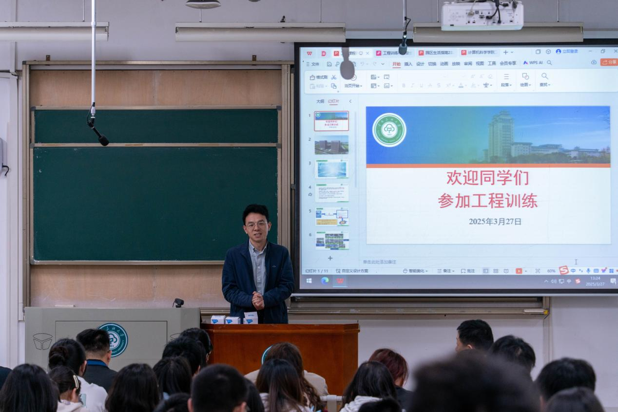 2025年3月27日下午13時,計算機科學學院在15號教學樓320教室開展2024級計算機類工程訓練(第一批)動員大會。未來城工程訓練中心主任賀軍,計算機科學學院副院長張瀟,未來城科技園管理辦公室老師龔育超,學院專任教師徐科、尹帆,教學秘書王珩,2024級輔導員黃炎壘,2024級143名學生參會。會議由王珩主持。