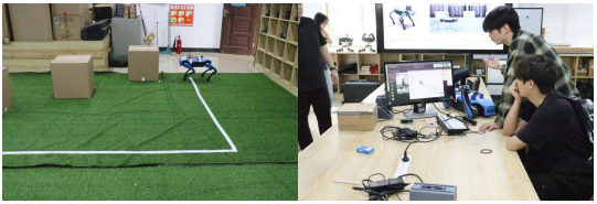 9時45分,9-410 教室的智能機器人實驗室熱鬧非凡。任愷、田微老師帶領團隊,為師生展示四足機器人的靈活身姿——掃描建圖、識別障礙、模擬地形行走,穩健步伐背后,是運動控制算法與機械結構設計的精妙融合;演示視頻中智能車在預設賽道上穿梭,循跡、紅綠燈、斑馬線等任務精準完成,車身上的傳感器與算法協同,詮釋著自動駕駛技術的前沿探索;Nao機器人則以趣味互動吸睛,跳舞、對話等場景,讓大家直觀感受人機交互的無限可能。老師分享的研發故事,讓師生對智能機器人研發的 “臺前幕后” 有了真切認知,點燃不少同學投身人工智能研發的熱情。