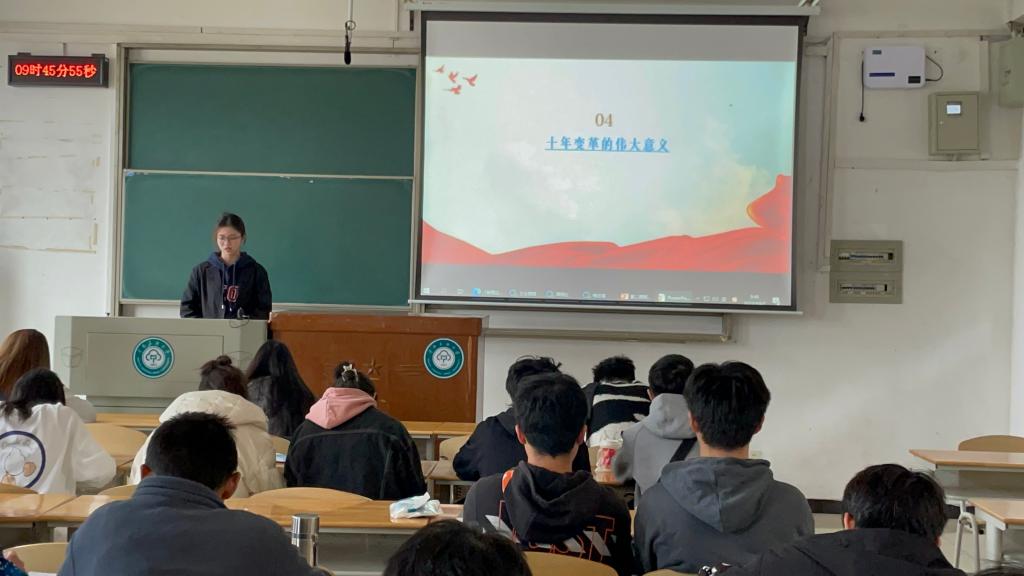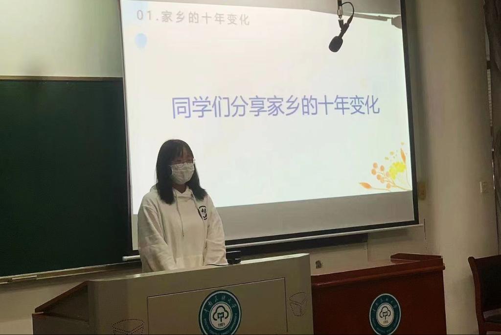 主題班會以圖片展示、數據分析、短視頻等多形式向同學們再現了十年來我國在經濟建設、脫貧攻堅、文化教育、生態文明等各方面的進步和變化,讓同學們感受到了十八大以來十年間深耕所獲得的輝煌成就。在自由發言中,同學們暢談近十年來發生在自己身邊的變化:從十年前的舊農村面貌談到現如今的新農村規劃;從“綠皮火車”談到高鐵的中國速度;從商場購物談到直播帶貨;從十年前教室上課到如今常態化疫情防控下的“云”課堂;從“筆”友、“網”友到微博超話、嗶哩嗶哩up主……社交媒體的交友模式日新月異,各大數據庫也為我們提供了海量在線學術資源,同學們感受到網絡與科技的發展給生活帶來的變化。