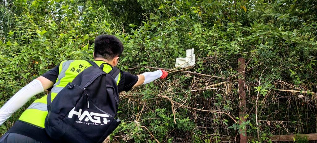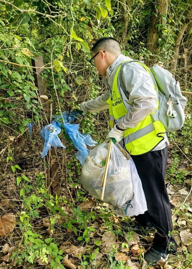 撿拾掛在樹叢中的塑料垃圾 楊波攝